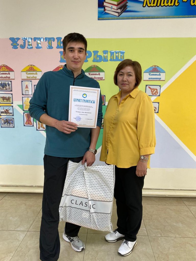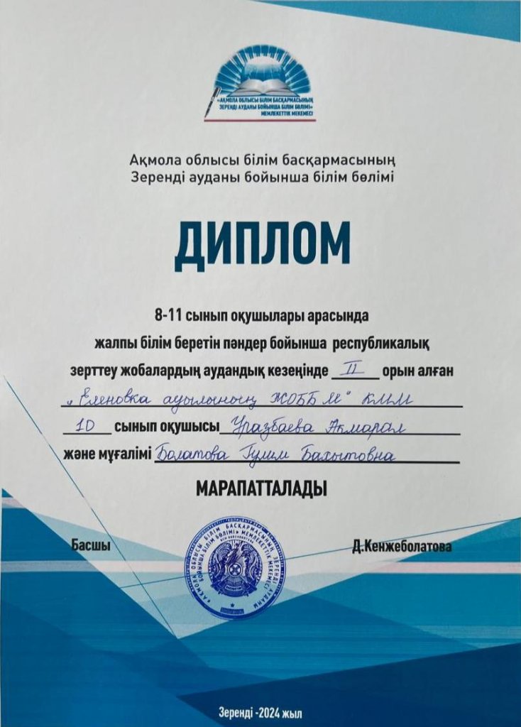 8-11 сынып оқушылары арасында жалпы білім беретін пәндер бойынша республикалық зерттеу жобалардың аудандық кезеңінде ІІ орын алған “Еленовка ауылының ЖОББМ” КММ 9 сынып оқушысы Уразбаева Акмарал және мұғалімі Болатова Гулим Бахытовна марапатталады.