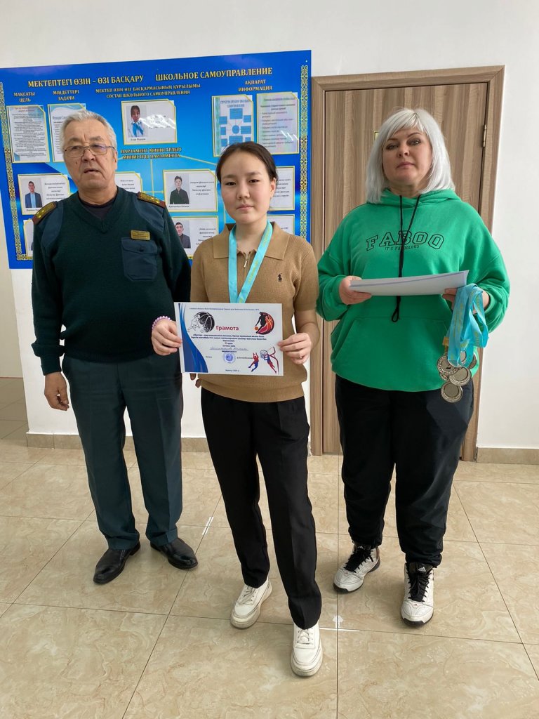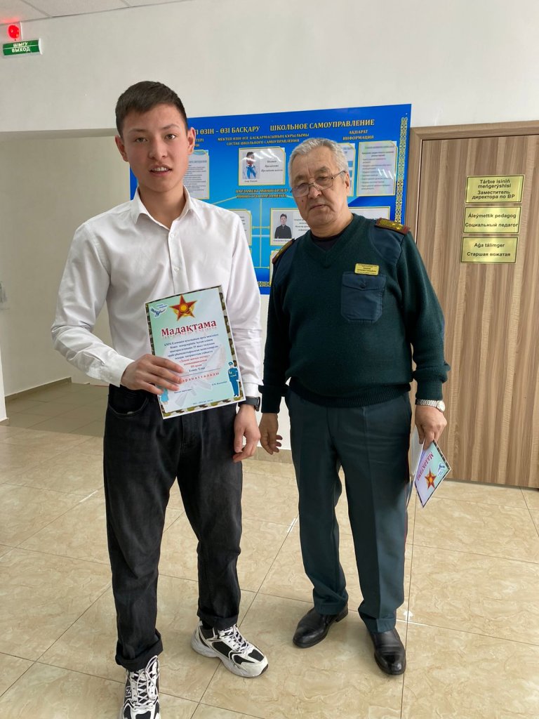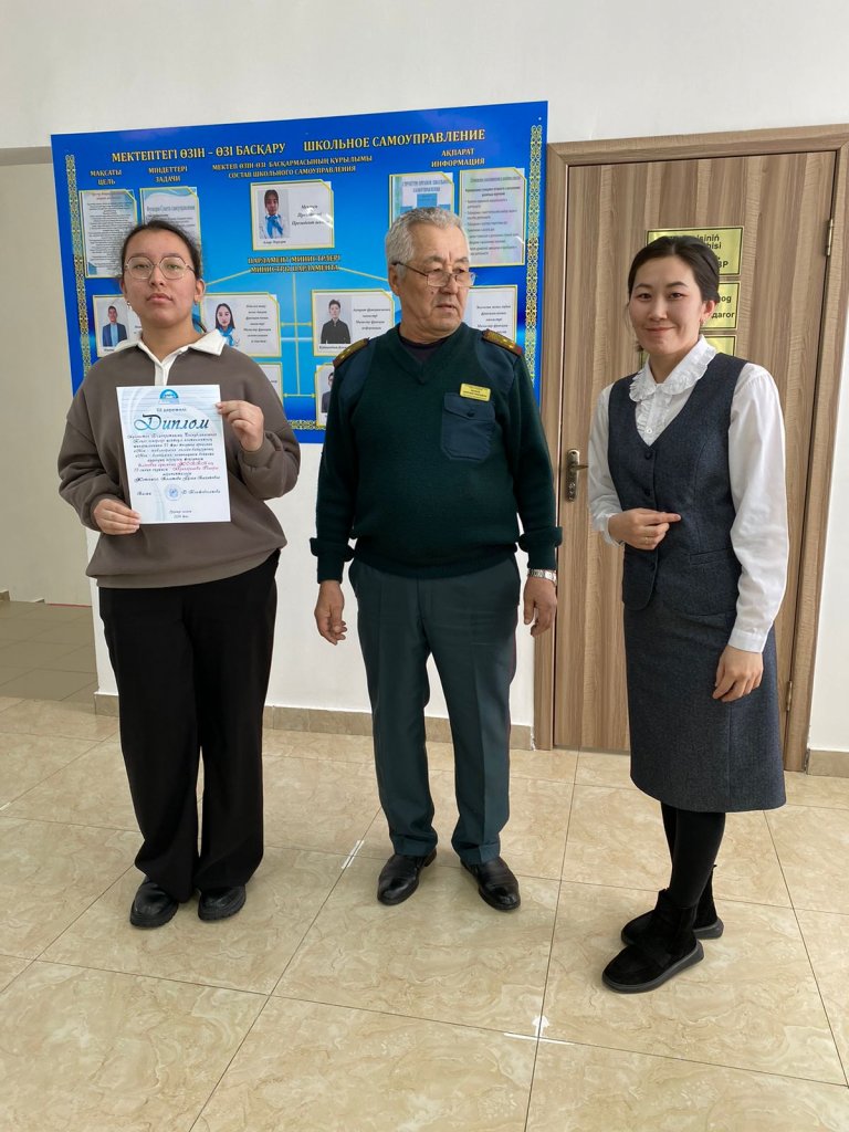 Ауғанстан Демократиялық Республикасынан Кеңес әскерлері шектеулі контингентінің шығарылғанына 35 жыл толуына арналған “Мен - экоблогермін” онлайн-байқауының “Мен - блогермін” номинациясы бойынша аудандық кезеңінің жеңімпаздары 10 “А” сынып оқушылары Асқар Меруерт І дәрежелі дипломмен марапатталды және Абдыкаримова Томирис ІІІ дәрежелі дипломмен марапатталды.