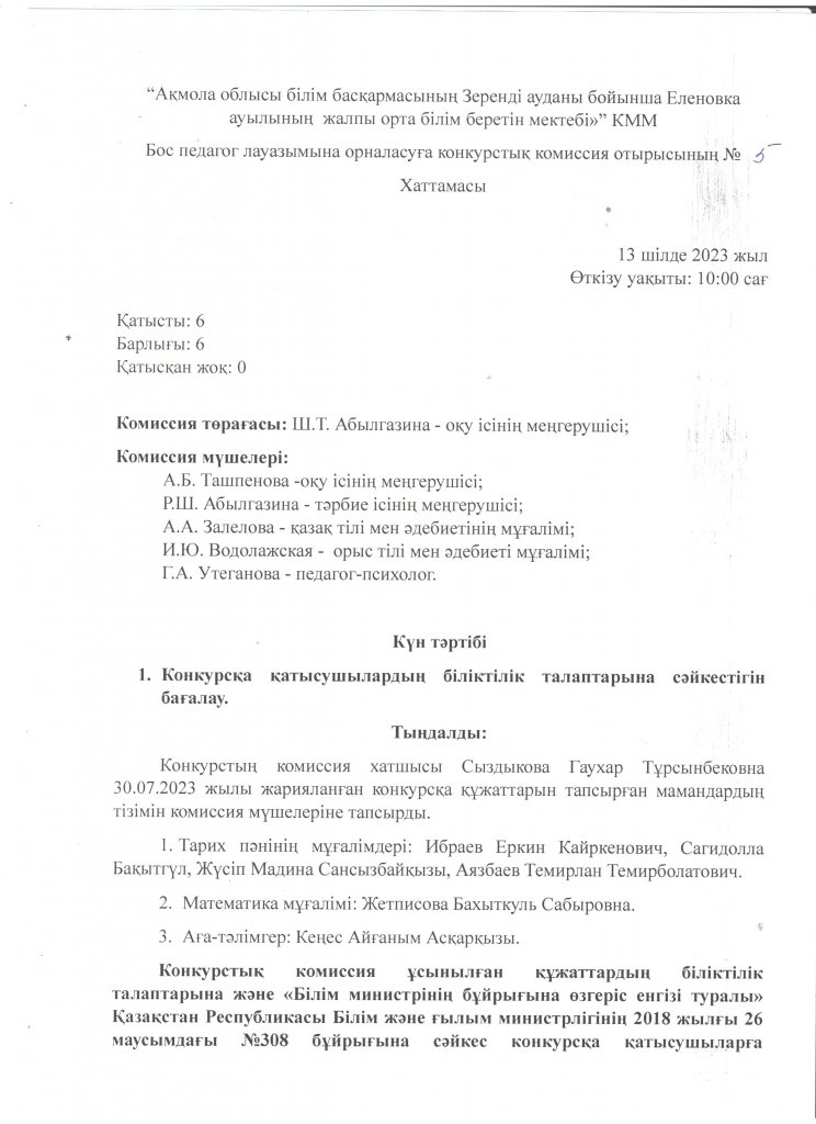 Бос педагог лауазымына орналасуға конкурстық комиссия отырсының №5 хаттамасы.