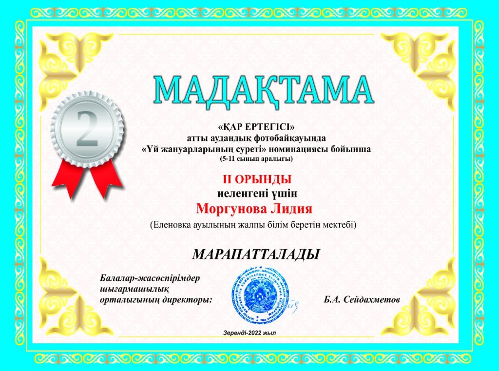 5 б сынып оқушысы Моргунова Лидия "Қысқы ертегі" фотобайқауында "үй жануарларының суреті"номинациясында 2 орын алды.