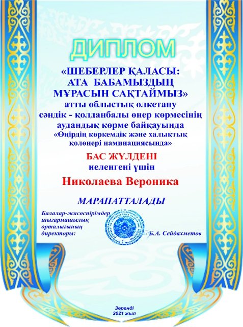 2021 жылғы 20 қазанда Зеренді ауданының балалар және жасөспірімдер шығармашылық орталығында "Шеберлер қаласы: Біз ата-бабаларымыздың мұрасын сақтаймыз және көбейтеміз" атты облыстық сәндік - қолданбалы өнер байқауы өтті, оған біздің мектептің...