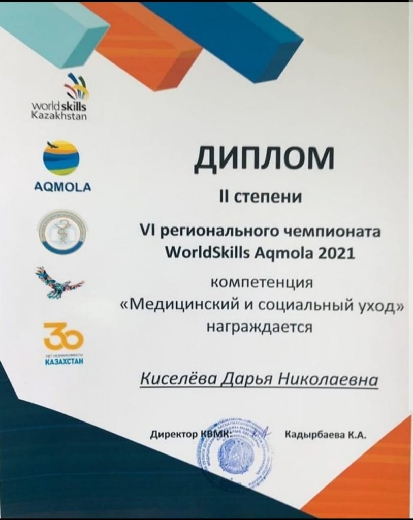 Мектебіміздің түлегі Киселева Дарья Көкшетау қаласының қалалық емханасында дәрігерге дейінгі кабинетте фельдшер болып жұмыс істейді. 2021 жылдың 25-26 наурыз аралығында "Медициналық және әлеуметтік күтім" құзыреттілігі бойынша "WorldSkills Aqmola 2021" VI аймақтық кәсіби...