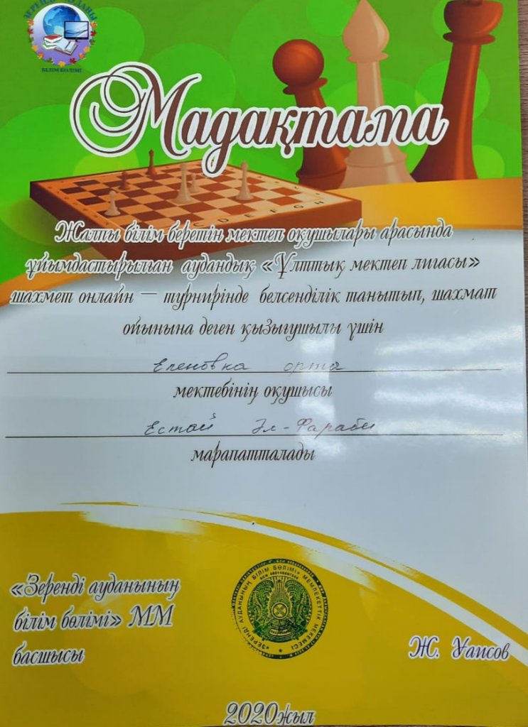 Жалпы білім беретін мектеп оқушылары арасында ұйымдастырылған аудандық "Ұлттық мектеп лигасы" шахмат онлайн - турнирінде белсенділік танытып, шахмат ойнына деген қызығушылығы үшін 9-сынып оқушысы Естай Әл-Фараби марапатталды. Құттықтаймыз! Жетістіктерің көп...