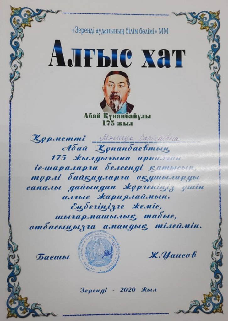 Абай Құнанбаевтың 175 жылдығына арналған іс-шараларға белсенді қатысып, түрлі байқауларға оқушыларды сапалы дайындап жүргені үшін қазақ тілі мен әдебиеті мұғалімі Шаймерденова Мәншүк Сартайқызы Зеренді аудандық "Білім бөлімі" ММ басшысы Ж.Уаисовтың...