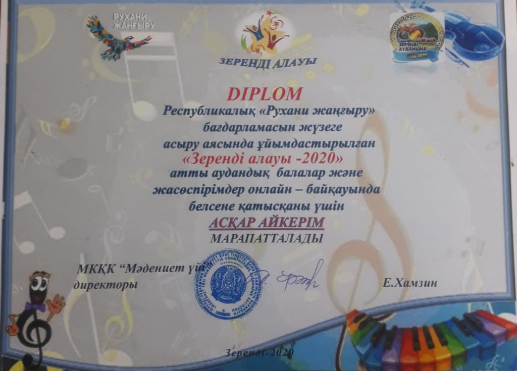 Республикалық "Рухани жаңғыру" бағдарламасын жүзеге асыру аясында ұйымдастырылған "Зеренді алауы-2020" атты аудандық балалар және жасөспірімдер онлайн - байқауында беслсенді қатысқаны үшін Асқар Әйгерім дипломмен марапатталды. Құттықтаймыз!