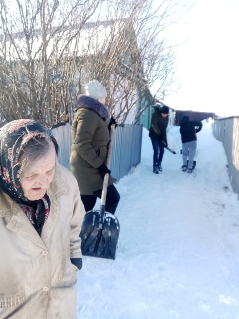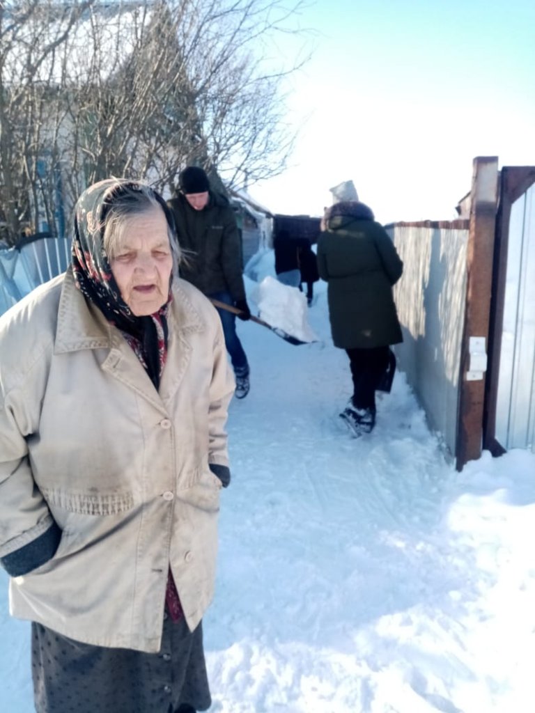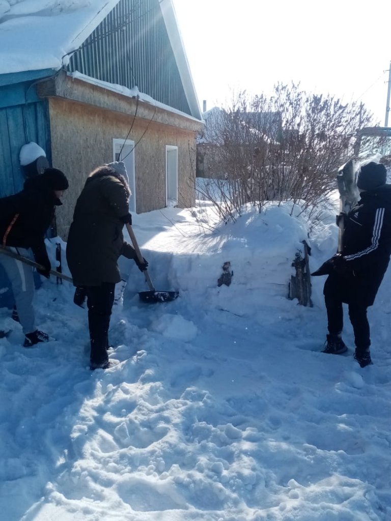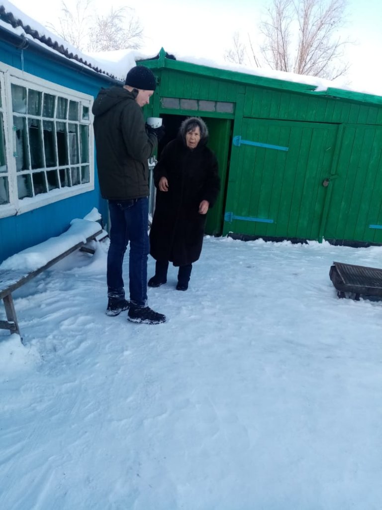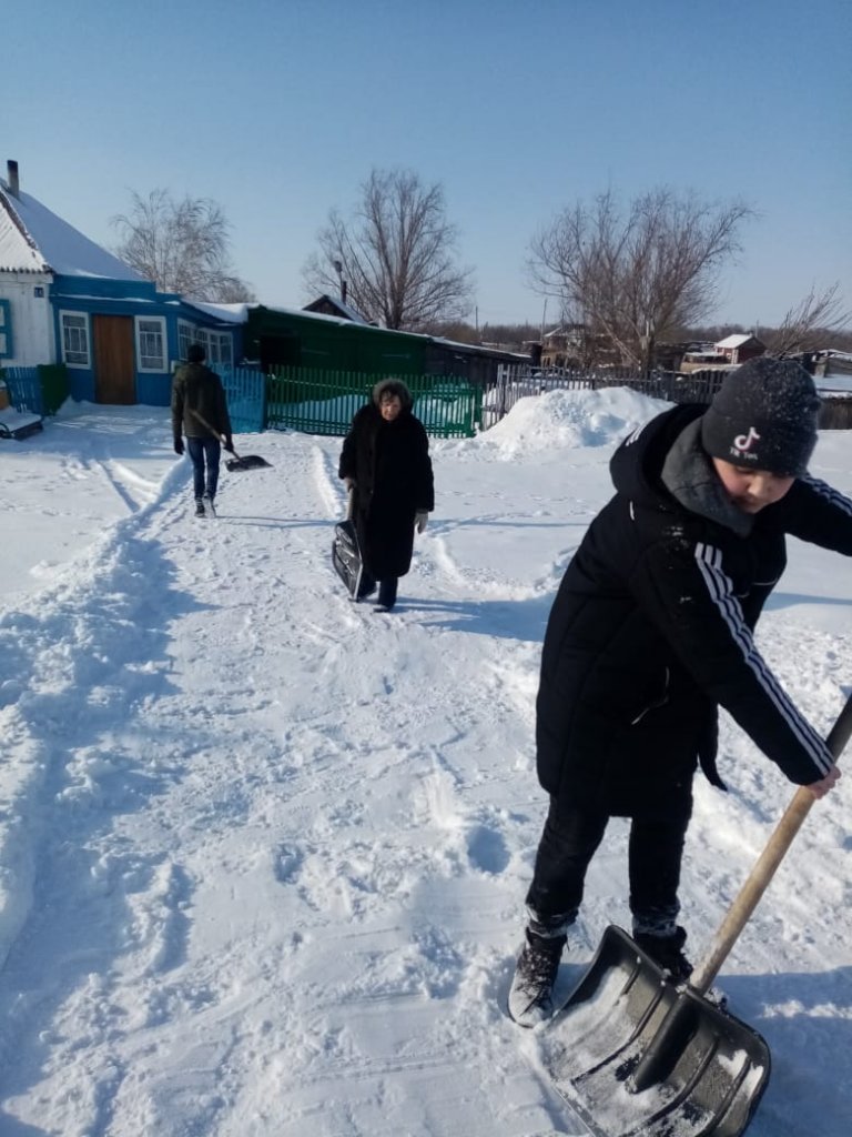 Еленовка орта мектебі оқушыларының "Қамқорлық" еріктілер бригадасы іс-әрекетте: Черников Анатолий Федорович 1938 ж.т. пен Черникова Галина Валентиновна 1940 ж. т. және педагогикалық еңбек ардагерлері Порхун Тамара Абрамовна мен Лаврик Мария Ивановна үйлерінің жанындағы қарды тазалау. 2 наурыз 2021 жыл