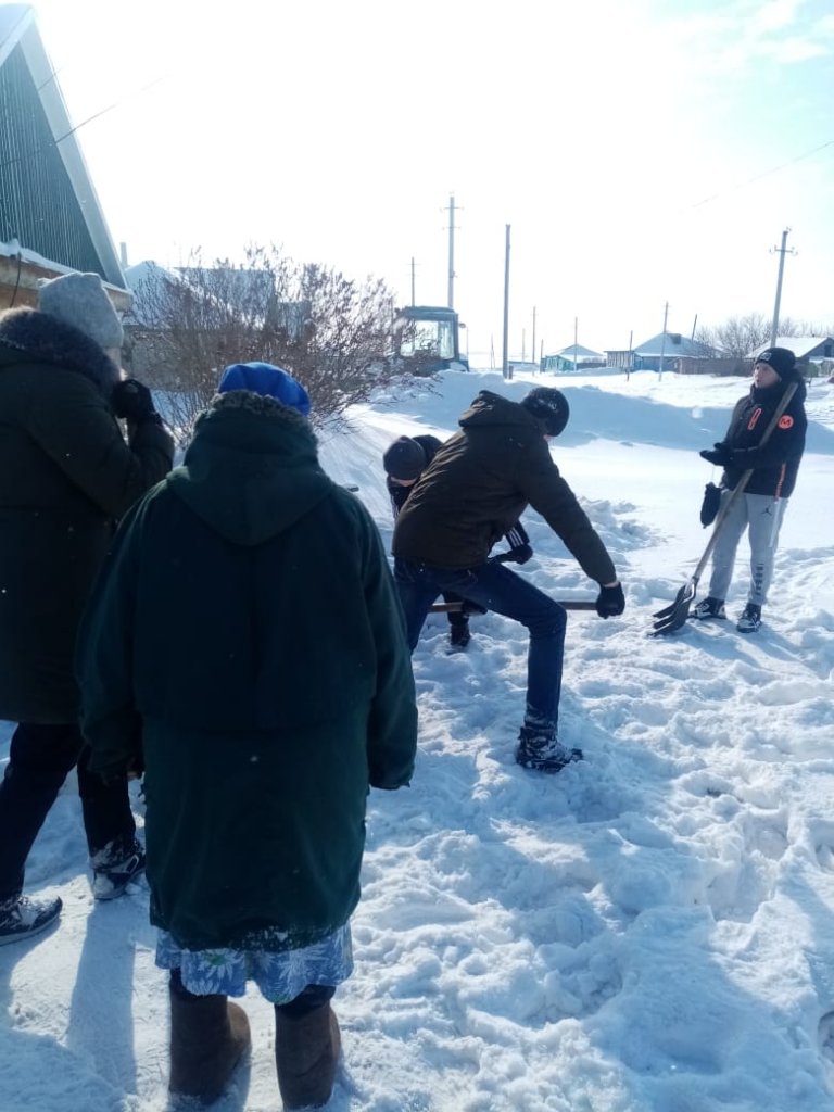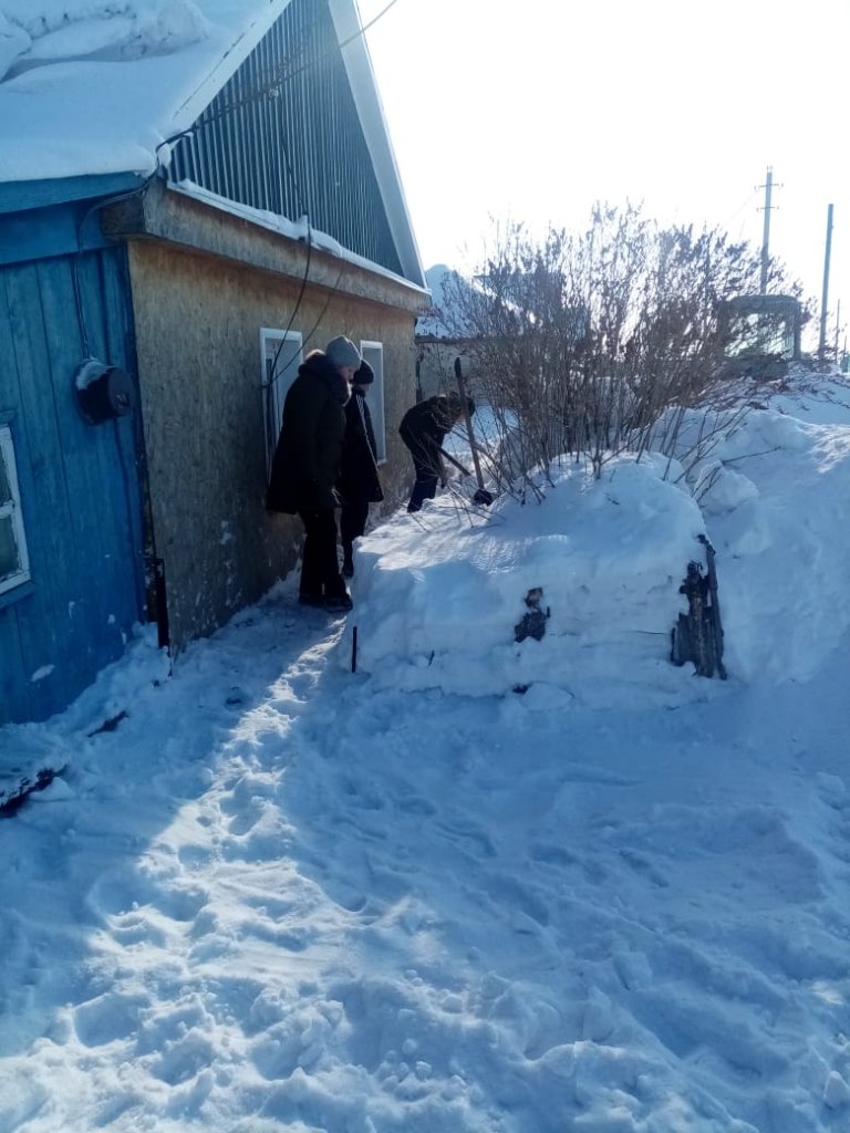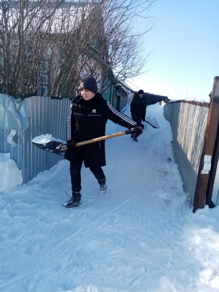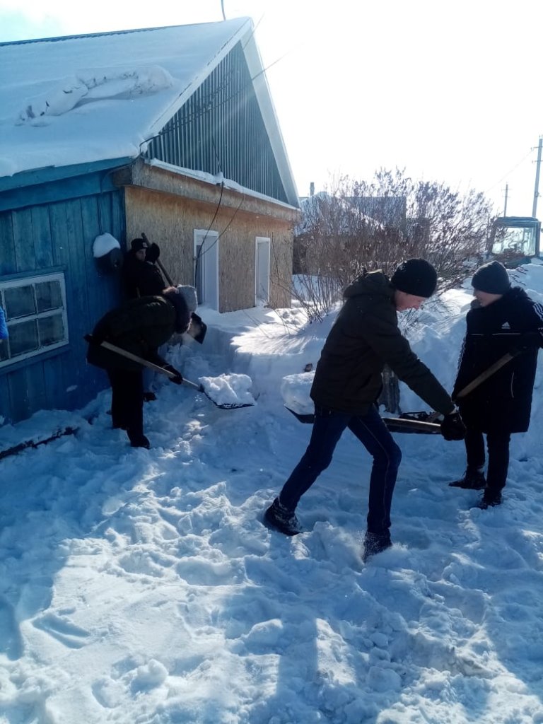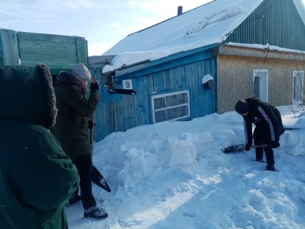 Еленовка орта мектебі оқушыларының "Қамқорлық" еріктілер бригадасы іс-әрекетте: Черников Анатолий Федорович 1938 ж.т. пен Черникова Галина Валентиновна 1940 ж. т. және педагогикалық еңбек ардагерлері Порхун Тамара Абрамовна мен Лаврик Мария Ивановна үйлерінің жанындағы қарды тазалау. 2 наурыз 2021 жыл