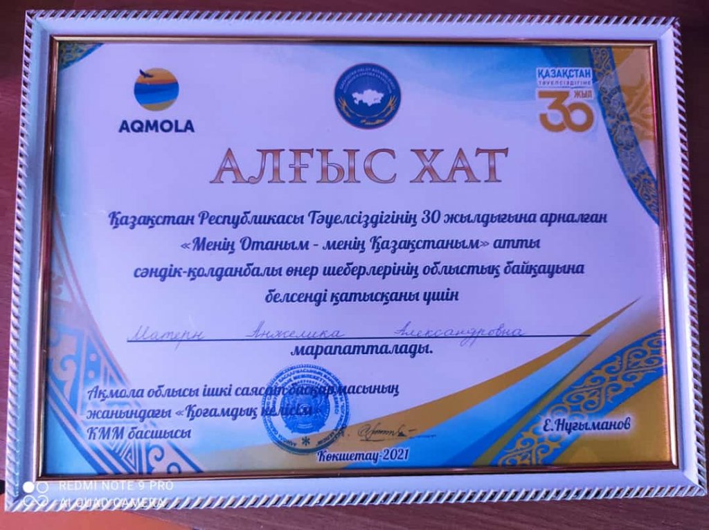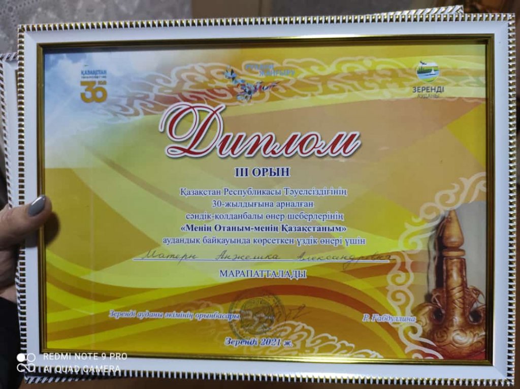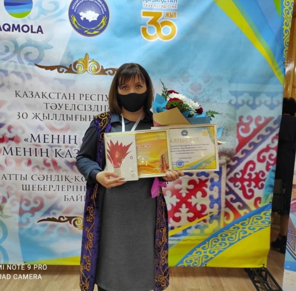 Қазақстан Республикасы Тәуелсіздігінің 30 жылдығына арналған "Менің Отаным - менің Қазақстаным"атты сәндік-қолданбалы өнер шеберлері мен қолөнершілерінің аудандық конкурсы. Көркем еңбек мұғалімі Анжелика Александровнаны құттықтаймыз және сәттілік тілейміз!
