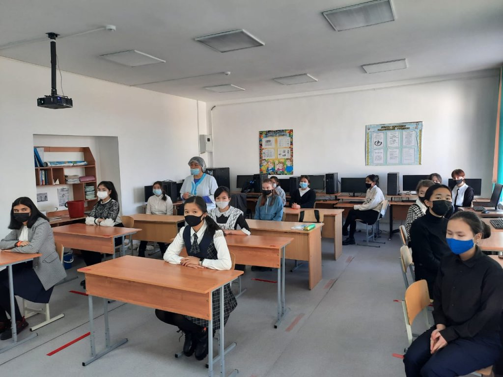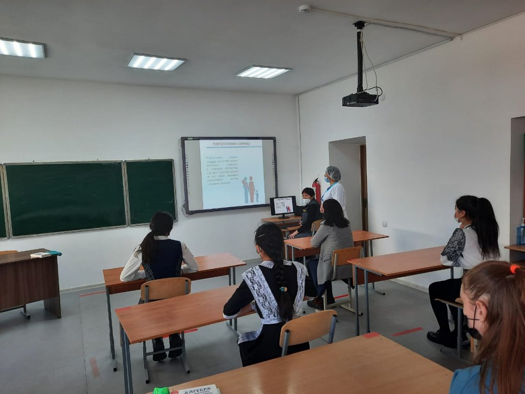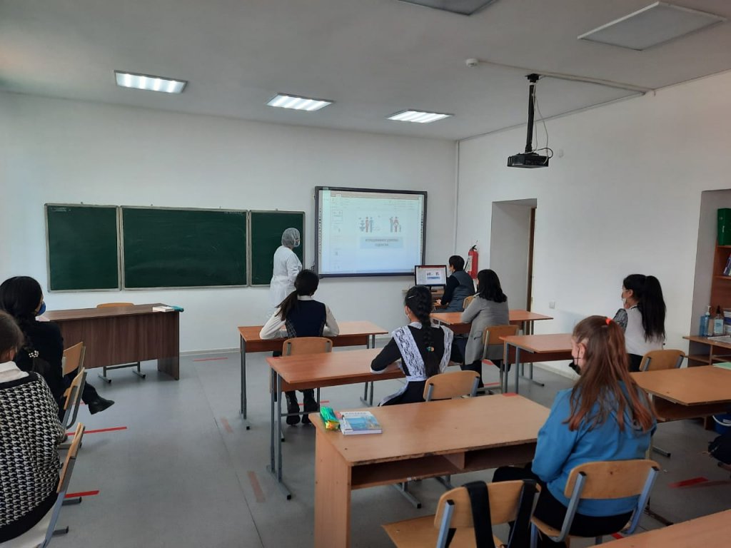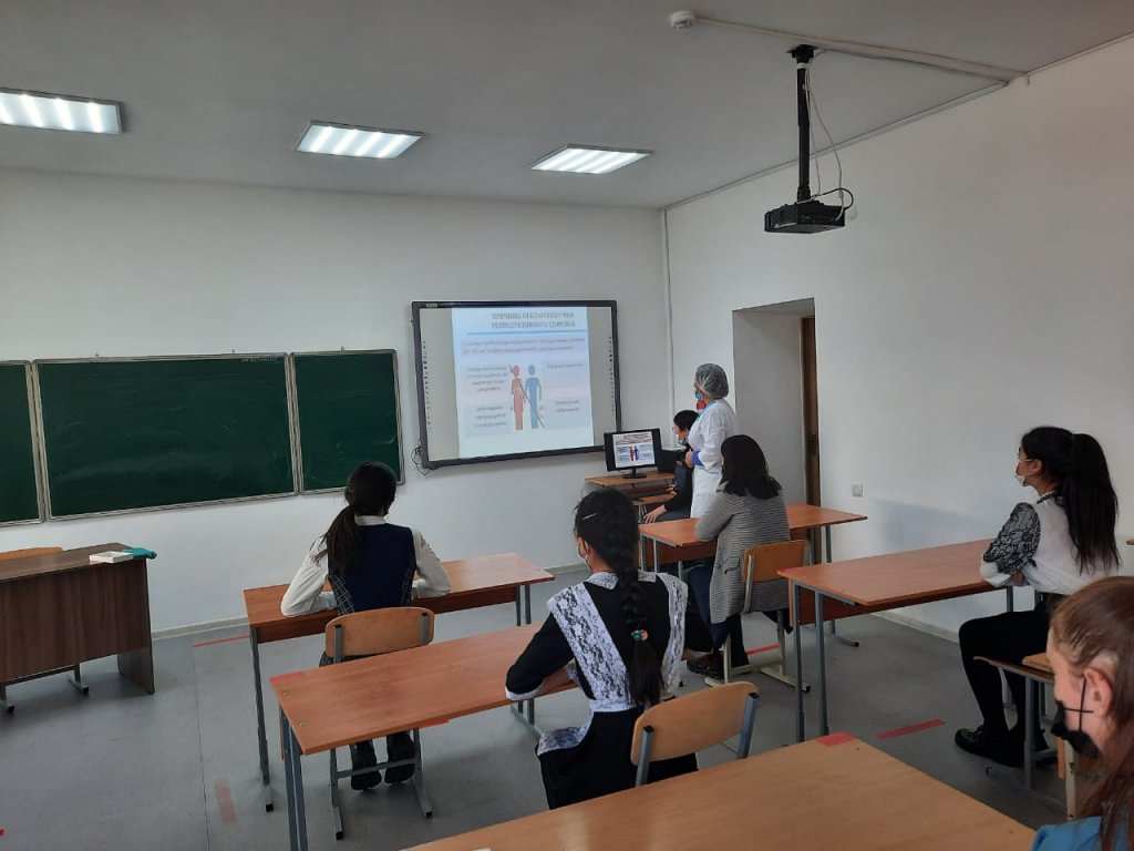 Медицина қызметкері Ж.Т. Каримбаева мен психолог Г. А. Утеганова 8-11 сынып қыздарымен жасөспірімнің репродуктивті денсаулығы тақырыбында әңгіме өткізді.