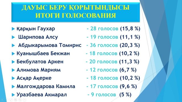 Абдыкарымова Томирис - 36 голосов (20,3 %)