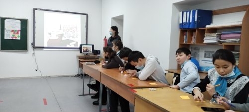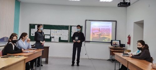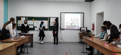 Ағылшын тілі мұғалімі Сейтахметова Ақерке Жанаталаповна 7 сыныпта"кітап оқимыз"тақырыбында ашық сабақ өткізді. Балалар мұғалімнің сұрақтарына жауап берді, кітаптардың сипаттамасымен жұмыс істеді (қандай сюжет, жанр, автор және т.б.). Балалардың әрқайсысы презентация жасады, оқыған кітабын салды, талқылау өткізді. Сабақ соңында балалардың әрқайсысы кері байланыс өткізіп, презентацияға стикерлер жапсырды.