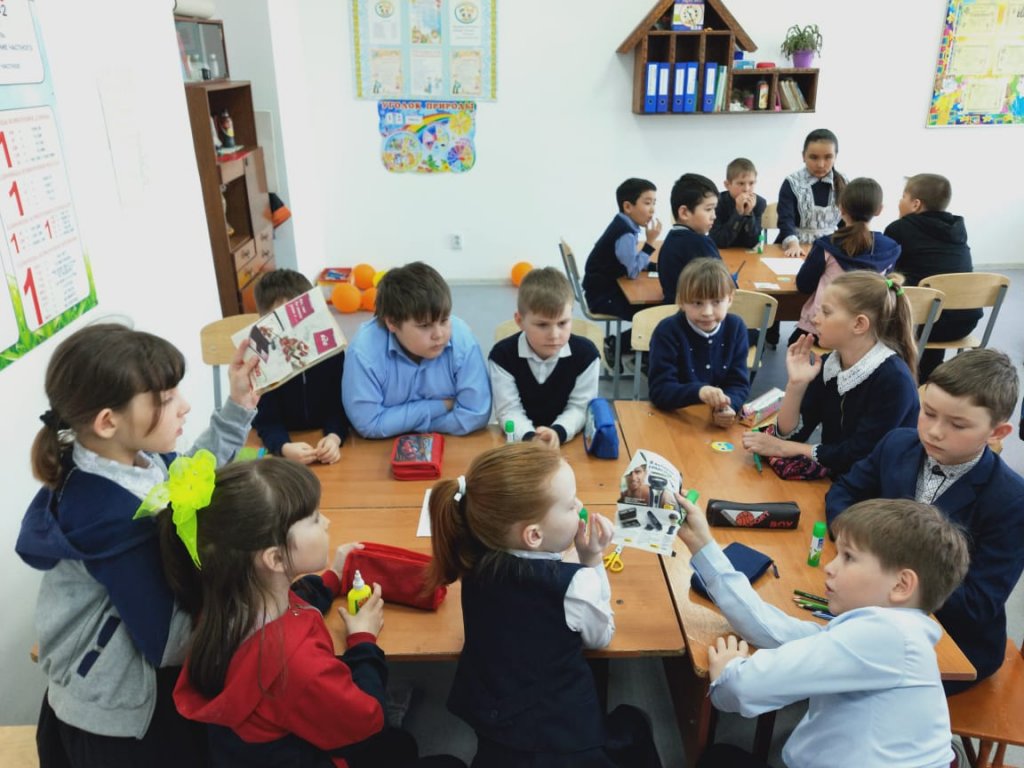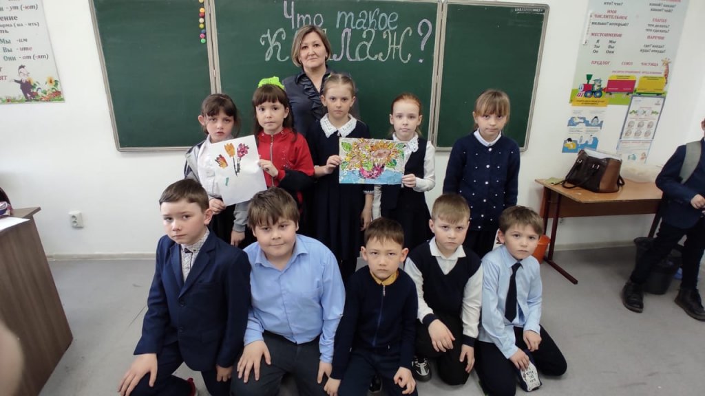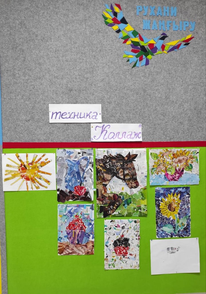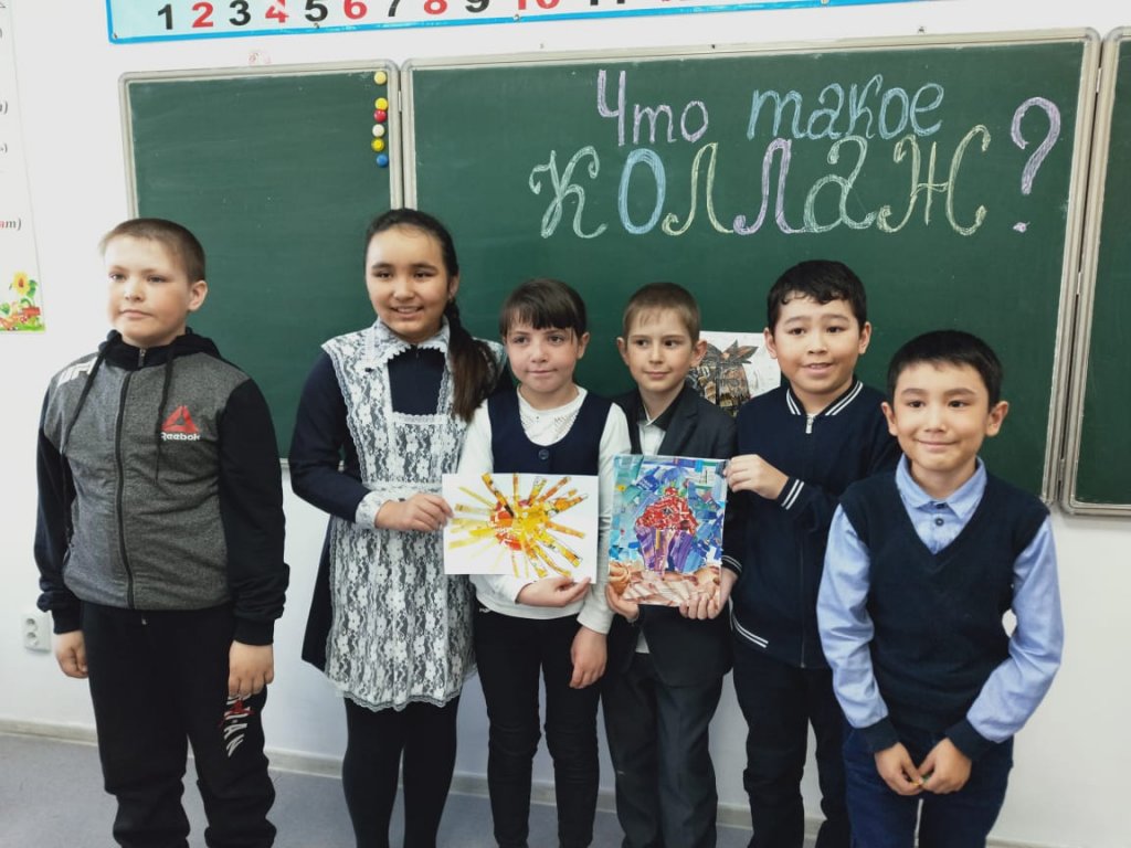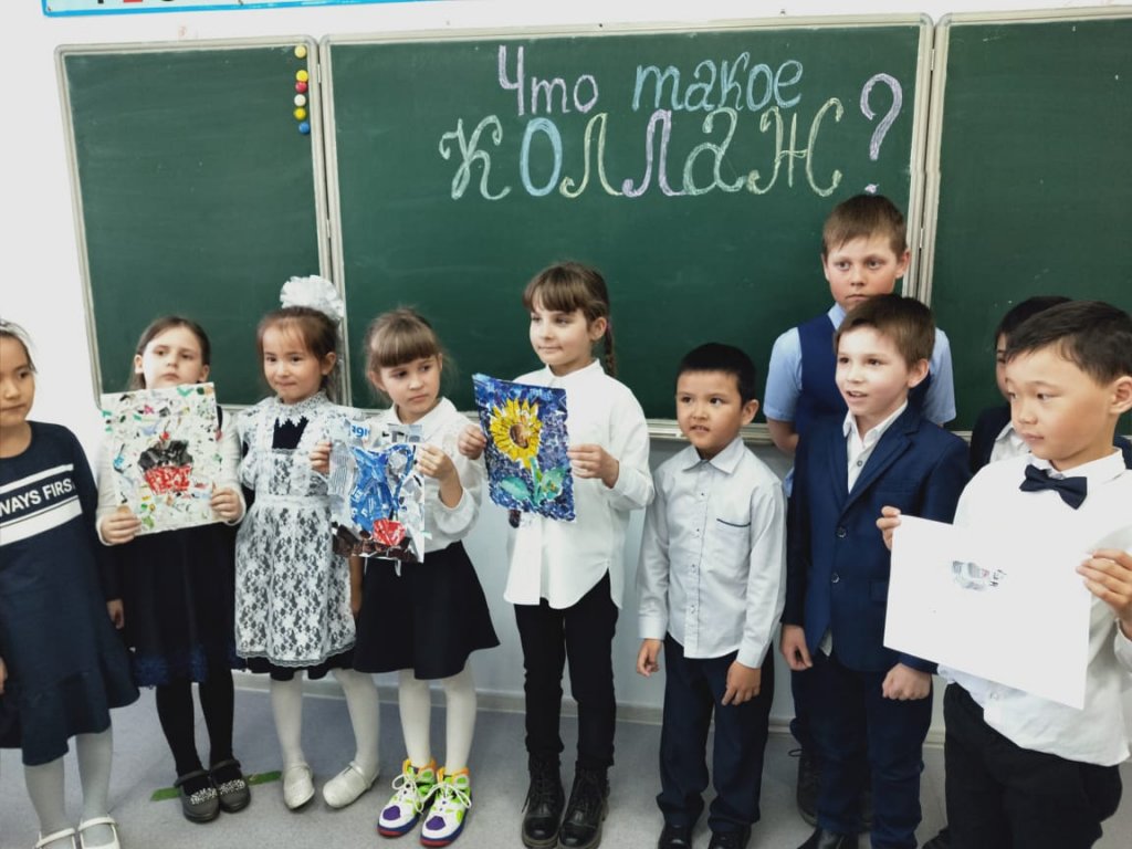 Көркем еңбек мұғалімі А. А. Матерн жетекшілігімен 1-3 сынып оқушылары коллаж жасады
