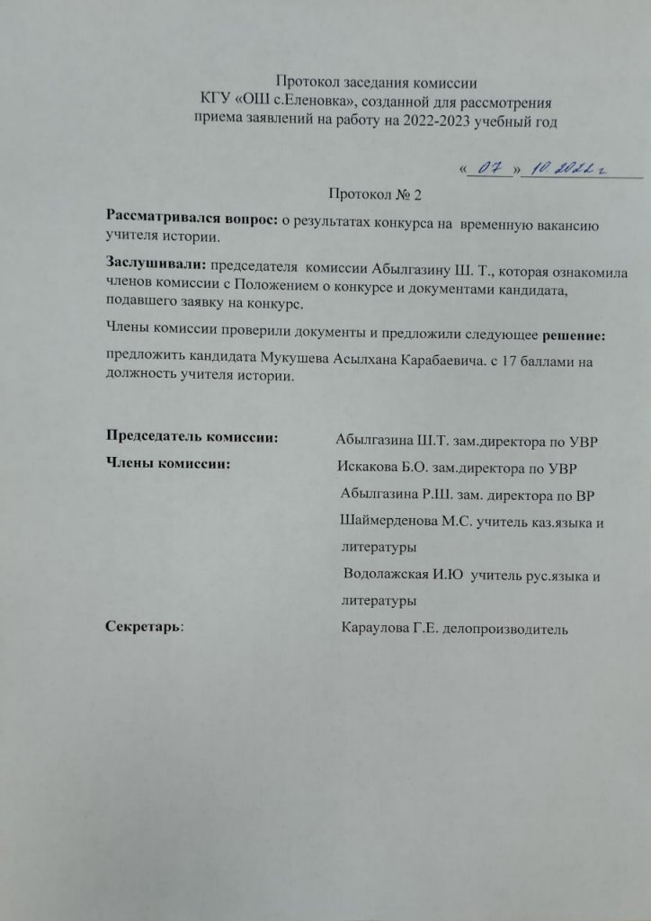 Тарих пәні мұғалімінің уақытша бос жұмыс орнына өткен конкурс нәтижелері туралы