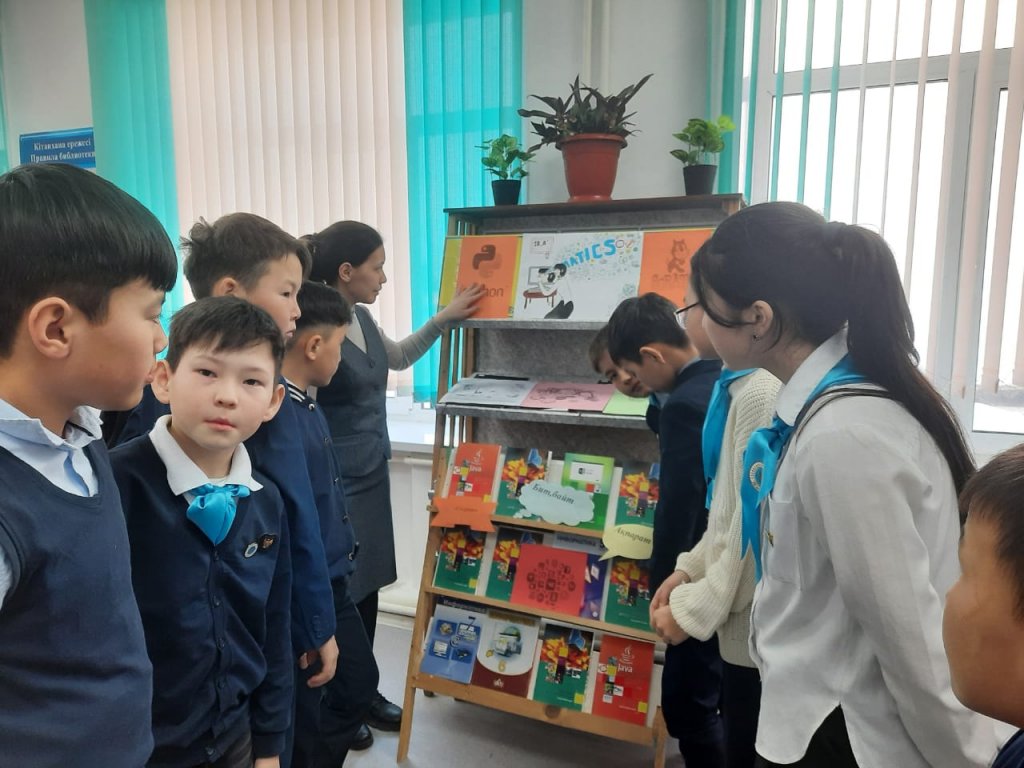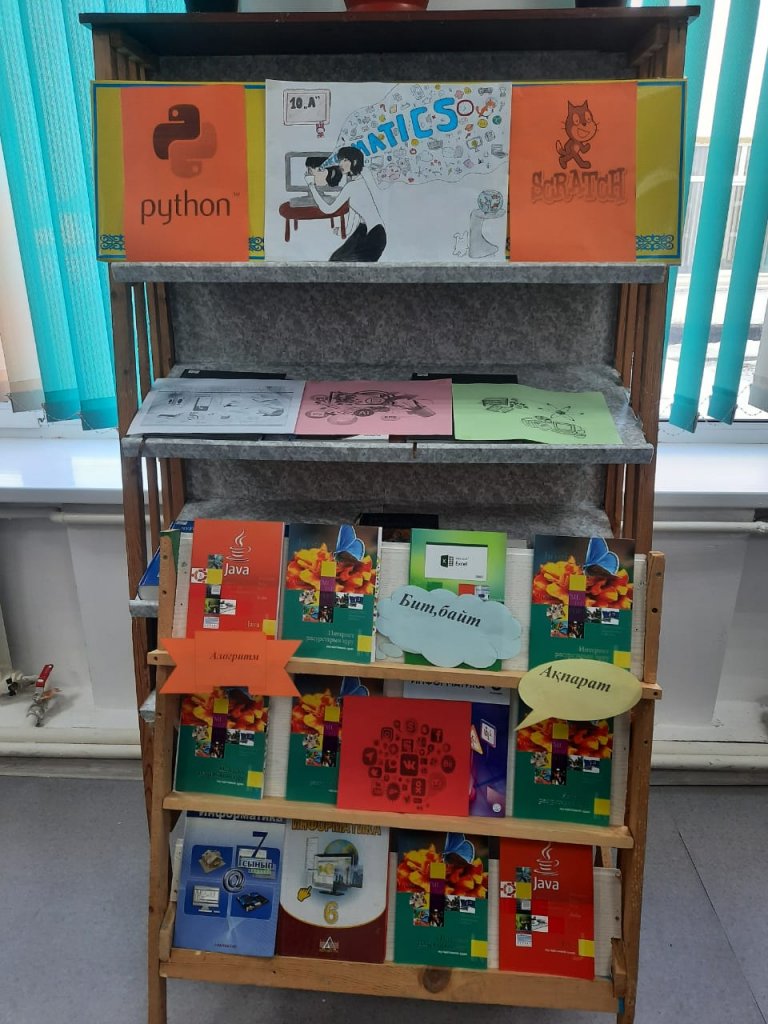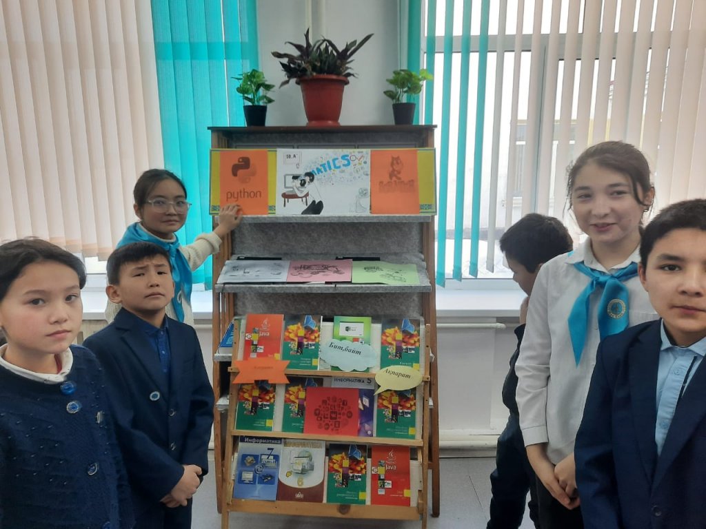 Математика, информатика, физика апталығында кітапханашы Айнагуль Кудайбергеновна мен информатика пәні мұғалімі Ернар Жазира “Интернет ресурстар” атты тақырыпта 5 А сынып оқушыларымен кітаптар көрмесін өткізді.