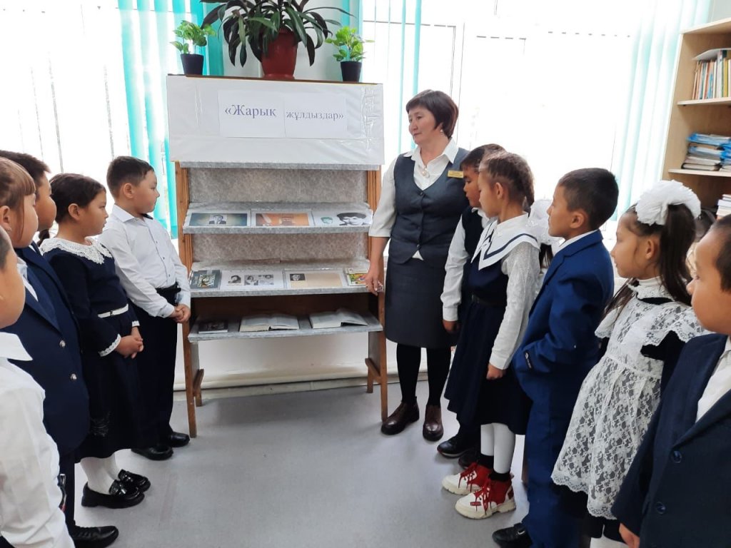 06.09.2023 Тілдер күні мерекесіне орай “ Жарық жұлдыздар” атты кітаптар көрмесі ұйымдастырылды. Осы көрмеге бастауыш сынып оқушылары қатысты.Кітапханашы Ержанова А.К.көрмемен таныстырып өтті.