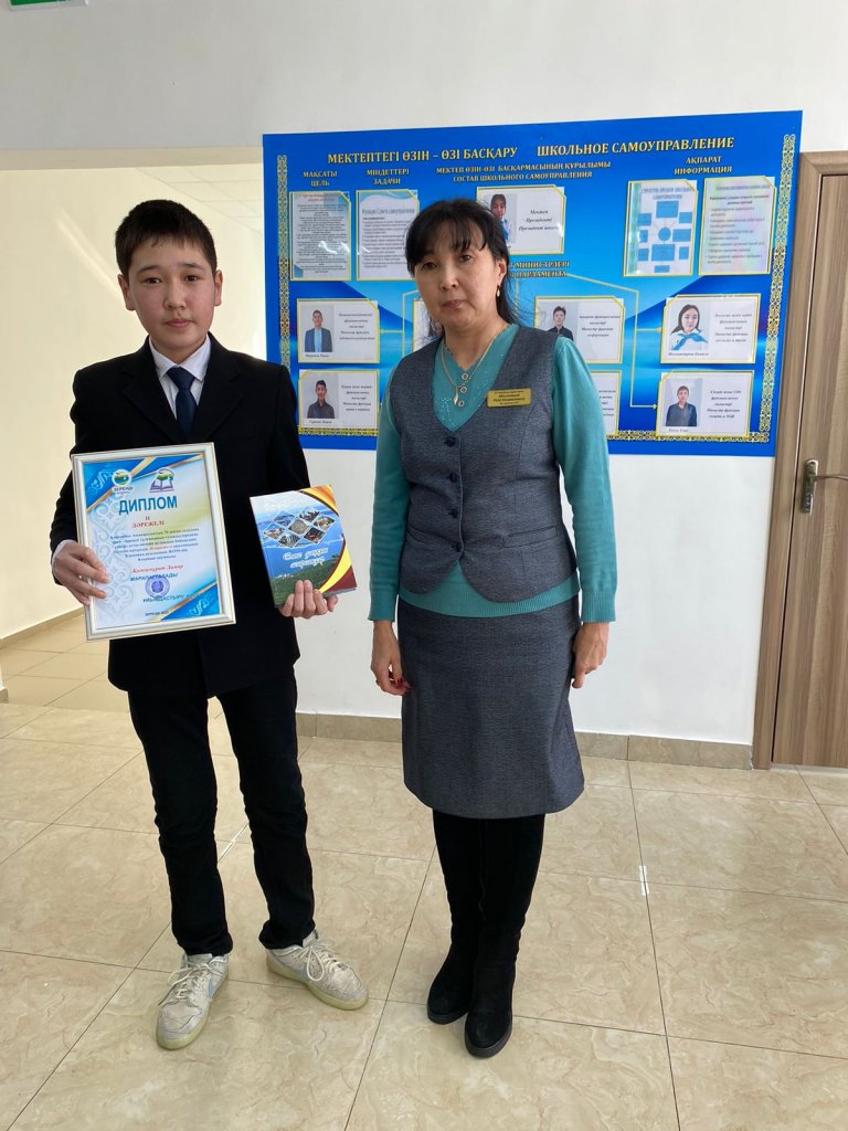 8 “Ә” сынып оқушысы Қажымұрат Дамир Қорғанбек Аманжоловтың 70 жасқа толуына орай “Зеренді тұлғасының туындыларынан үзінді” атты онлайн аудандық байқауына белсене қатысып, ІІ-дәрежелі дипломымен марапатталды.