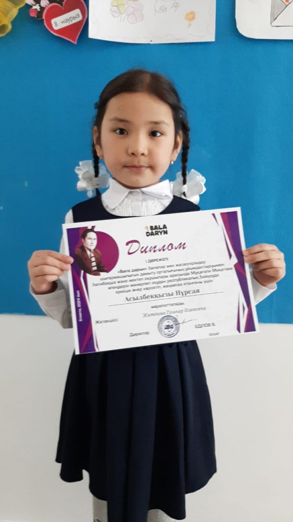 "Бала дарын" балалар мен жасөспірімдер шығармашылығын дамыту орталығының ұйымдастыруымен мектеп оқушылары арасында Мұқағали Мақатаев өлеңдерін мәнерлеп оқудан республикалық байқауда ерекше өнер көрсетіп, жеңімпаз атанғаны үшін 1 "А" сынып оқушылары Абдуллаева Аружан және Асылбекқызы Нұрсая І дәрежелі дипломдарымен марапатталды. Мұғалімі: Житенова Гульнар Изатовна.