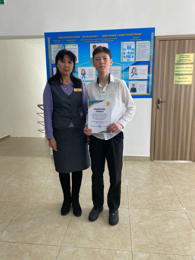 "Еленовка ауылының ЖОББМ" КММ өткен “Достың да, досы бар” атты пікірталас сайысында “Үздік спикер” номинациясымен Куанышбаев Бекжан марапатталды.